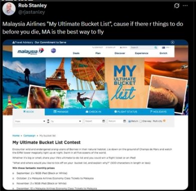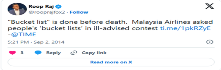 Malaysia Airlines introduced the “My Ultimate Bucket List” promotion in September 2014, calling for customers to submit their bucket-list travel destinations. The competition, with rewards of iPads and economy-class airline tickets, was designed to engage the public following the recent tragedies of Flight MH370 (March 2014) and Flight MH17 (July 2014). However, the use of the term “bucket list,” referring to things one wants to do before they die, became highly problematic given the recent deaths of 537 passengers in those tragic events.
